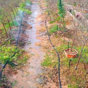 Trải ống mềm xẹp dọc theo hàng cây, mỗi gốc gắn một béc tưới, bán kính tưới 0,5–1m, cung cấp nước tập trung cho bộ rễ.